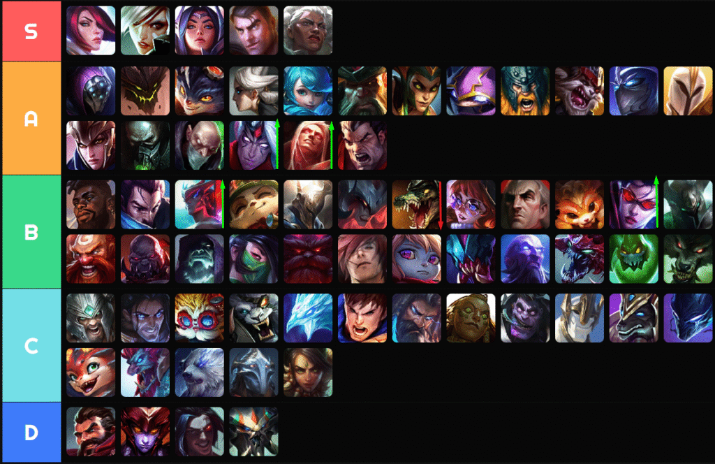 Not too many changes in the solo queue department as well. Most notable changes are depicted with green and red arrows. Consult the first blog post if you’re interested in what each tier means.