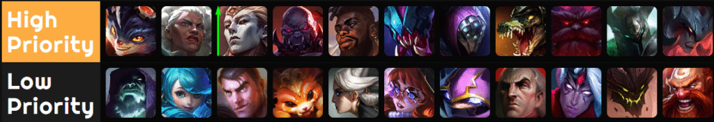 Notably, Zaahen has been released in a quite overpowered state and currently resides at the top of the high priority list. Even after the hotfix nerf, and with a mediocre early game, this champion is a complete menace with 1st item power spike and only becomes stronger as the game progresses. (He does seem to struggle a bit vs ranged champions and Jax if you were looking for quick info on what’s good against it).