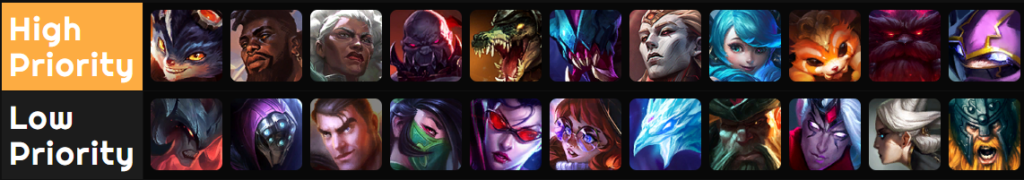 Yorick is pretty much gone from competitive play. Laning phase is easier to bypass than ever and he scales terribly into the late game with ADCs being stronger overall. Kennen is promoted into high priority with the nerfs to Ryze, Jayce and Malphite (in the previous patch). You will still want to avoid playing into Sion and K’Sante, even though that is a lesser concern in solo queue.