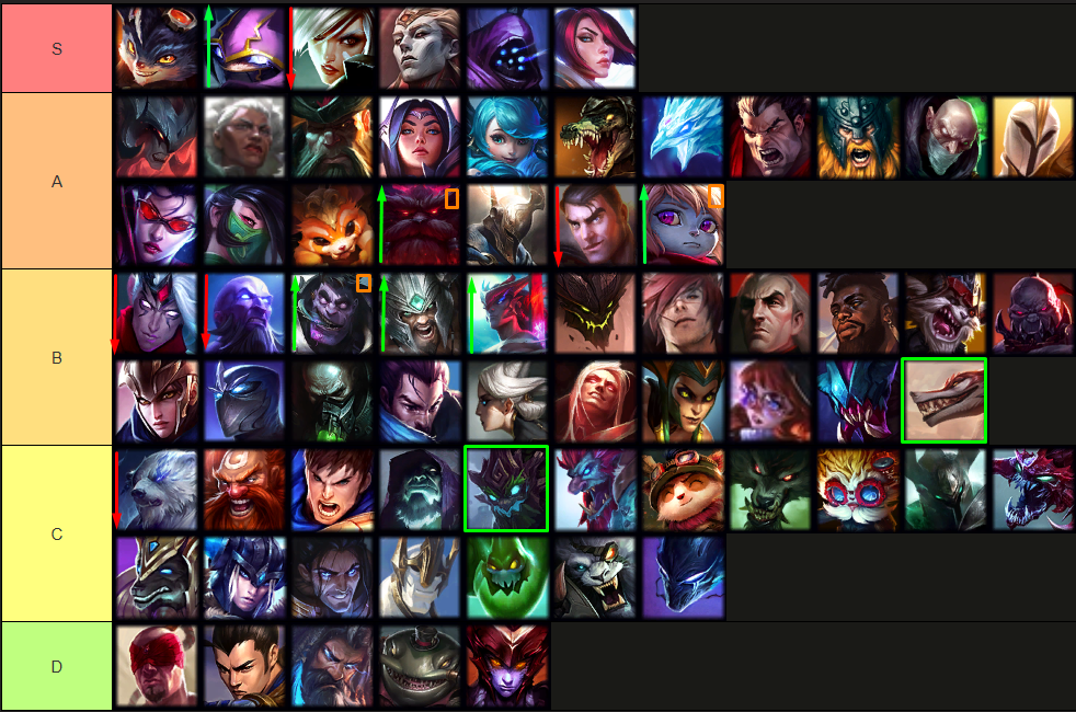 Added Maokai and Naafiri to the tier list. Corrected ratings for scaling tanks, Mundo and Ornn (undervalued them previously) and Poppy (good into top tier except Kennen and Rumble). Varus going down to B again due to steep nerfs and I adjusted the tier list for other minor changes. The higher the elo you play in, the higher value champions like Sion and K’Sante will have, but overall they’re not great for climbing as they’re on the early game spectrum side of tanks.