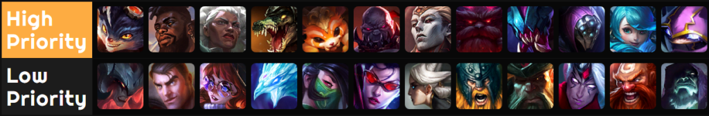 Gnar priority is rising. He’s answering the meta game well, along side Gwen (though her priority will go down with nerfs in 16.4) while the counter picks like Jax are not performing well into Gnar at the moment. The reason for the priority spike is the higher Ambessa ban rate and more Renekton blind picks.