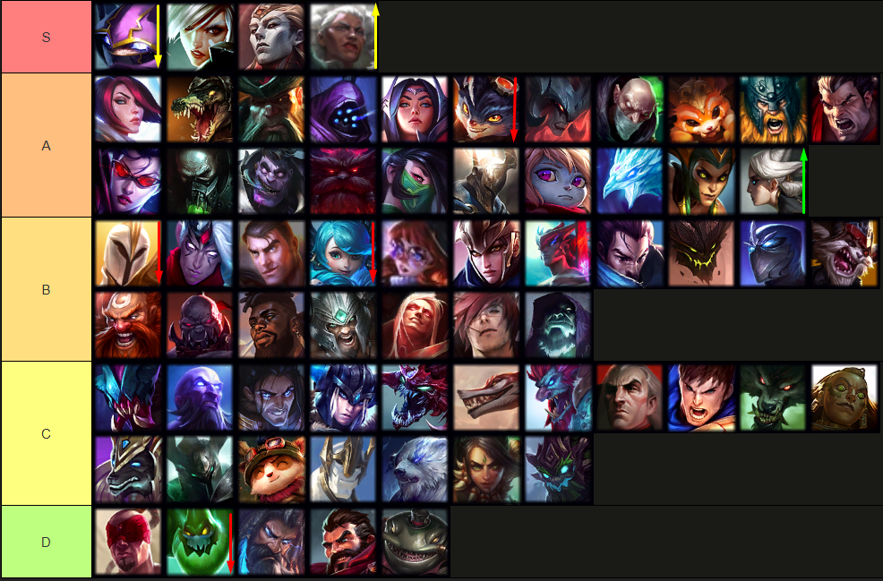 Rumble, Gwen and Kayle down a tier. Camille back to the bottom of A tier. Rest of the tier list remains fairly stable. Reminder: champions like Varus, Aurora and even Jayce are A tier in the apex tiers of solo queue (M+).